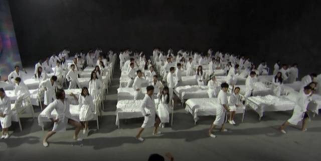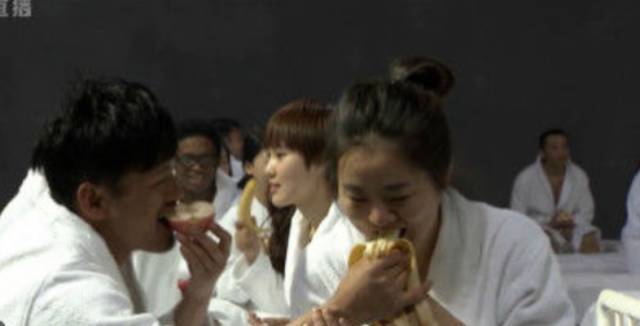 整场直播先是让100个穿浴袍的参与者做了一小时广播体操,接着半小时唠嗑,中间穿插群众吃水果环节,镜头故意留了些“似是而非”的画面,最后以一朵像雾像霾又像不明气体的“蘑菇云”收尾,直播就此结束。