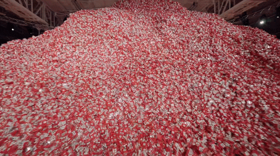 由20万盒杜蕾斯包装盒堆叠而成的巨型山丘,视觉冲击力十足,密集的排列甚至让不少人感到一丝密恐不适。
