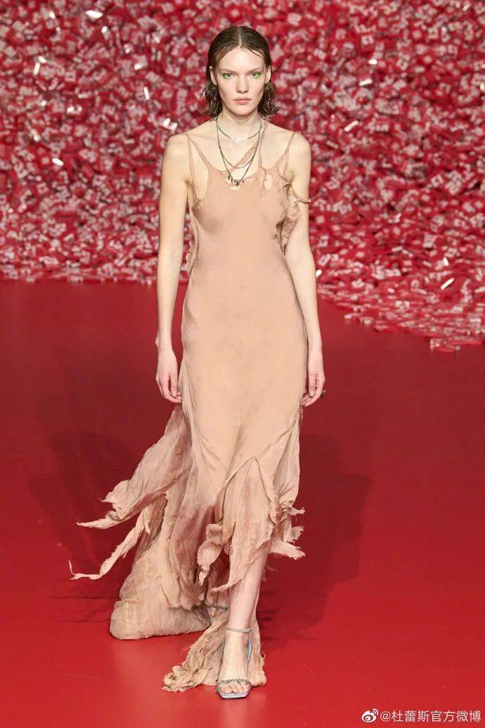 从其他秀场款式中也能看到双方合作的细节,比如用精湛的烧花工艺让牛仔布呈现出类似墙皮剥落的质感,裸露的肌肤和薄膜的设计,呼应了杜蕾斯一贯擅长的性感隐喻风格。
